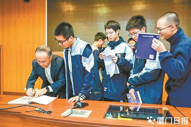 这位科学家受到中学生热烈欢迎,他们请他在自己的化学书上签名,请求和他合影,张涛都一一满足,他还为厦门一中写下“热爱科学,热爱化学,为祖国强盛发奋学习”的寄语。
